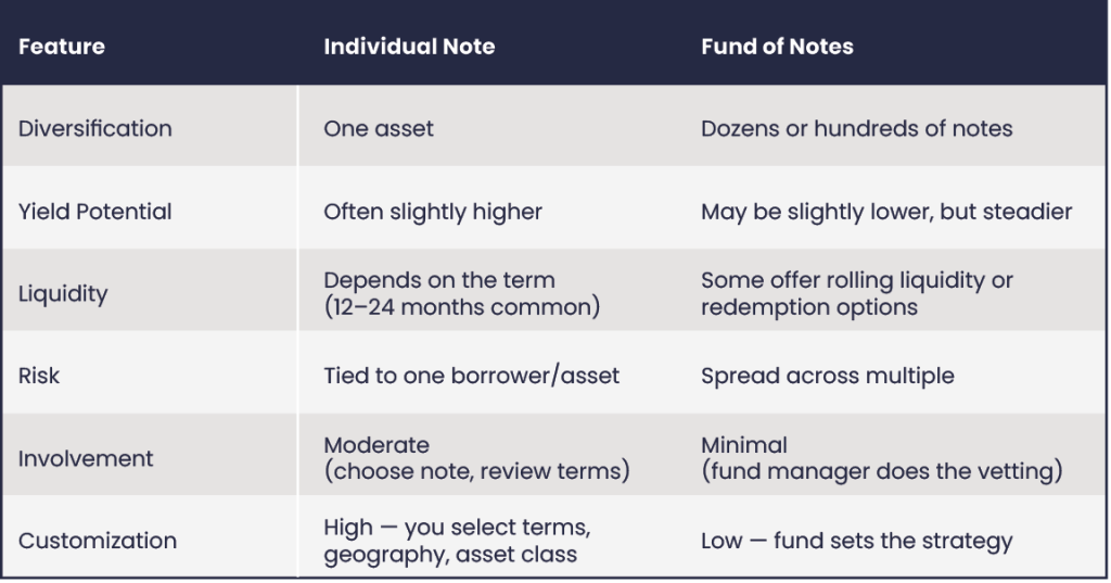 An individual note and a fund of notes deliver different results when it comes to yield, liquidity, diversification, time involvement and risk exposure.