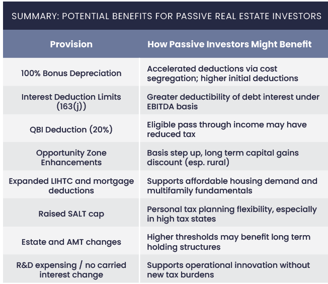 On July 4, 2025, President Trump signed into law the One Big Beautiful Bill Act (also known as BBB or OBBBA). This sweeping legislation both permanently extends many provisions of the 2017 Tax Cuts and Jobs Act and adds new, real estate friendly incentives. Passive investors in institutional quality real estate assets including apartments, self storage, hotels, express car washes, and real estate debt should consider how the bill may benefit their investments going forward.
